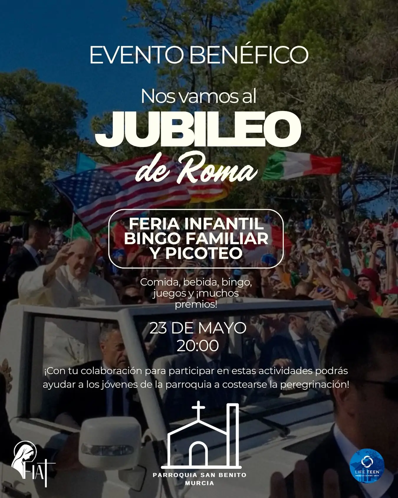 Desde San Benito participarán unos 25 miembros de los grupos juveniles parroquiales: el de Life Teen, dirigido a adolescentes de Secundaria y Bachillerato; y el de Fiat, para mayores de 18 años. Para que estos jóvenes puedan costear su peregrinación, la parroquia acogerá el próximo viernes 23 de mayo un evento benéfico. Comenzará a las 20:00 horas e incluirá talleres infantiles, un bingo familiar con el que han contribuido distintos comercios locales, comida y juegos.