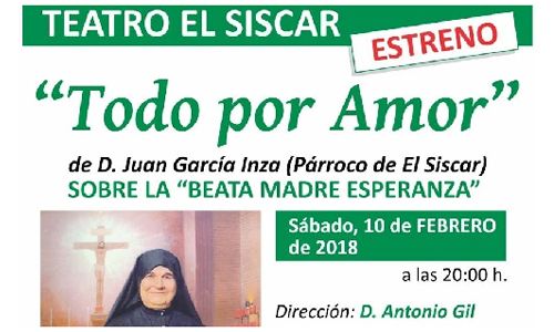 Este próximo sábado, 10 de febrero, a las 20:00 horas, se estrena en el teatro de El Siscar, “Todo por amor”, una obra inspirada en la vida de la Beata Madre Esperanza, escrita por Juan García Inza, párroco de esta pedanía de Santomera.