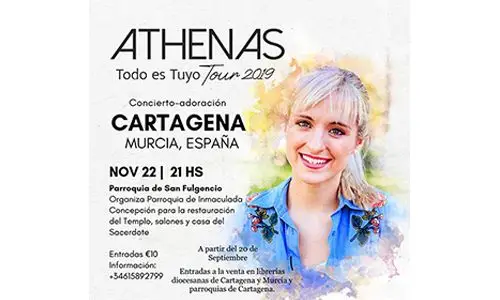 La parroquia de San Fulgencio de Cartagena acogerá el 22 de noviembre, a las 21:00 horas, el concierto-adoración “Todo es tuyo” a cargo de Athenas, una de las más reconocidas compositoras e intérpretes de música de alabanza en castellano. El concierto forma parte de la gira internacional con el mismo nombre que la cantante argentina está llevando a cabo para presentar su nuevo disco.