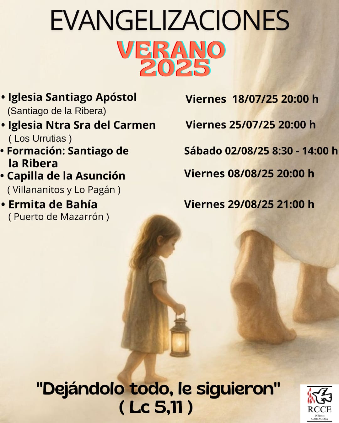 La primera de estas evangelizaciones será mañana viernes en la Parroquia Santiago Apóstol de Santiago de la Ribera (San Javier), a las 20:00 horas. La siguiente cita será el viernes 25 de julio, en la Parroquia Nuestra Señora del Carmen de Los Urrutias (Cartagena) a esa misma hora. Continuará el viernes 8 de agosto, también a las 20:00 horas, en la playa de Villananitos y en Lo Pagán (San Pedro del Pinatar), en la capilla de Nuestra Señora de la Asunción; y se cerrará el viernes 29 de agosto en la ermita de Nuestra Señora de la Asunción de Bahía, en Puerto de Mazarrón, donde los evangelizadores están convocados a las 21:00 horas. Cada una de estas evangelizaciones comenzará con la celebración de la Eucaristía, seguida de una alabanza y de un rato de adoración eucarística para, después de un envío, salir a evangelizar en el paseo marítimo y calles cercanas al templo.