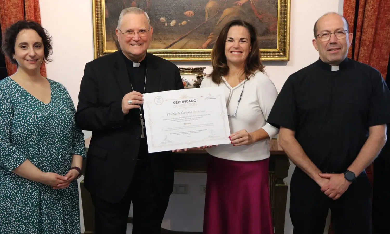 En un acto celebrado en el Obispado de Cartagena, Mons. José Manuel Lorca Planes recibió el diploma que acredita su incorporación a esta red internacional, impulsada por el Tourism and Society Think Tank y presente ya en 18 países de Europa, América y África. La entrega fue realizada por la directora general de la Red Mundial, la murciana Pilar Valdés Arroyo, acompañada por el vicario episcopal de la Zona Caravaca-Mula, David Martínez Robles, y delegada episcopal de Medios de Comunicación Social, María de León.