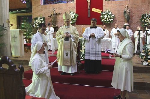 Tras el interrogatorio y el rezo de las letanías de los santos, la hermana Patricia realizó su profesión perpetua. De manos del Obispo, recibió las insignias propias de la profesión: el anillo, el crucifijo y la corona de flores, como signo externo de la dedicación perpetúa a Dios.