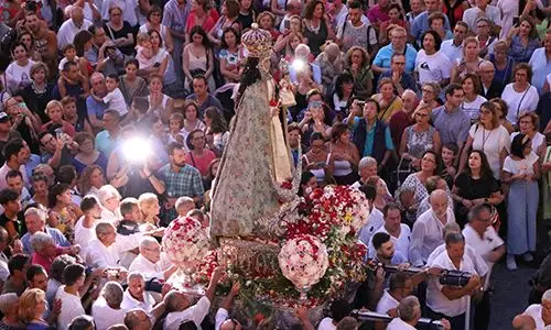 Engalanada con el terno, obsequio de su anterior camarera, Pilar de la Cierva, con motivo del quincuagésimo aniversario de su coronación, ‘La Morenica’ salió de su santuario en el monte a las 15:30 horas, para ser recibida en la parroquia de Nuestra Señora del Carmen por el Obispo de Cartagena, Mons. José Manuel Lorca Planes, acompañado por el Cabildo de la Catedral, autoridades locales y regionales y un gran número de fieles.