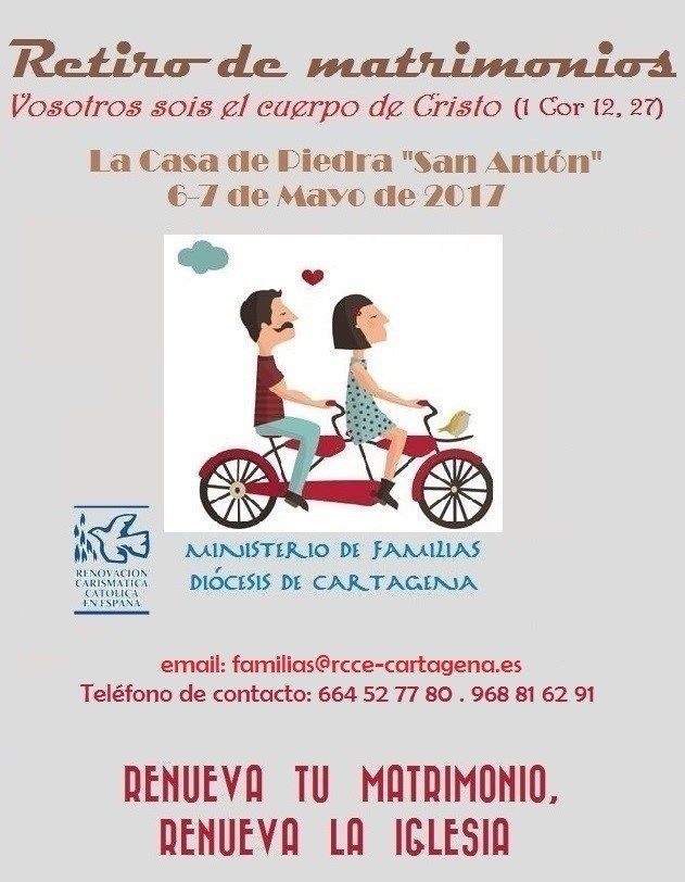 El ministerio de familias de la Renovación Carismática ha organizado un retiro diocesano de matrimonios, que se celebrará durante los días 6 y 7 de mayo en La Casa de Piedra, situada cerca de Sangonera la Verde y Torre Guil. Bajo el lema “Vosotros sois el cuerpo de Cristo”, el retiro está dirigido a matrimonios y parejas de novios, sean o no miembros de este movimiento católico, que quieran profundizar en su vocación. Asimismo, se invita a las familias a acudir con hijos, ya que habrá guardería y actividades para ellos.
