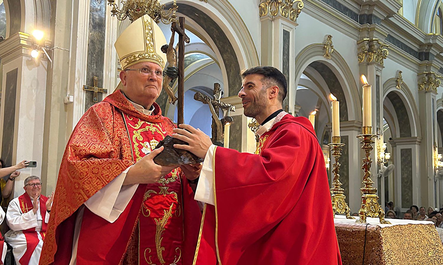 Cases le regaló al obispo, en nombre de toda la comunidad parroquial y del pueblo de Espinardo, una réplica del Cristo de la Salud realizada por los hermanos Cava que Mons. Lorca agradeció emocionado. «El sacerdote es imagen de Cristo, en él encuentra el espejo donde mirarse para ser después su reflejo. Cuando mire esta imagen sifa pidiendo por su pueblo; por todos los sacerdotes; las religiosas, especialmente las hermanas de la Consolación y las Hijas de la Caridad que trabajan en Espinardo; por los seminaristas y especialmente el de esta parroquia; por todos nosotros que le queremos».