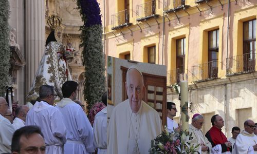 Con una imagen del Papa Francisco en el presbiterio se celebró ayer en Murcia la tradicional Misa Huertana en el Día del Bando de la Huerta. Una jornada festiva que se desarrolló con sobriedad y moderación tras el reciente fallecimiento del Sumo Pontífice. «A él le hubiera gustado que no hubiéramos suspendido esta fiesta, porque es en honor de la Madre», aseguraba durante la homilía el obispo de Cartagena, Mons. José Manuel Lorca Planes. A pesar de estar dentro de los tres días de luto oficial decretados por el Gobierno de España, para el prelado este día de fiesta era «una ocasión para mirar al cielo en honor de él y en el de toda Murcia» y pedir la intercesión de la Virgen de la Fuensanta para que el sucesor de Pedro «alcance la vida eterna».