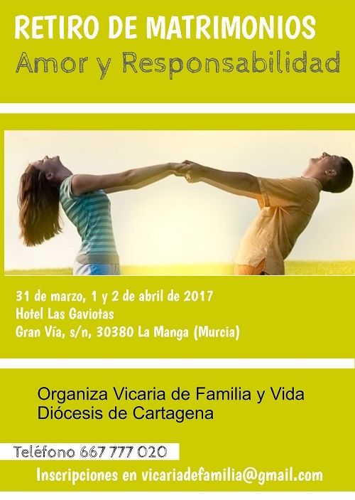 La Vicaria de Familia y Vida ha organizado un retiro para matrimonios que tendrá lugar los días 31 de marzo, 1 y 2 de abril en el Hotel Las Gaviotas, de la Manga del Mar Menor. El retiro tiene por lema “Amor y responsabilidad», nombre de la obra que San Juan Pablo II escribió antes de ser elegido Pontífice de la Iglesia Católica, y sobre la que girará el fin de semana, en el que se pretende reflexionar sobre la Teología del Cuerpo del Santo Pontífice.