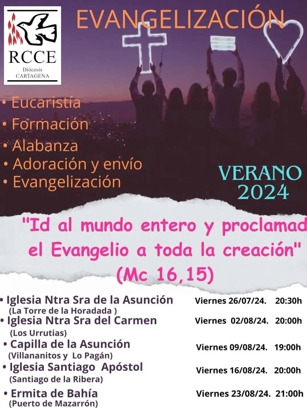 Por cuarto año consecutivo, la Renovación Carismática Católica (RCCE) en la Diócesis de Cartagena organiza una actividad de evangelización que llevará el kerigma a distintas localidades de costa bajo el formato de Una luz en la noche: evangelizadores que, de dos en dos, se acercan a los viandantes para anunciarles que Cristo está vivo y les ama, y para invitarles a entrar en la iglesia que, esa noche, permanece abierta y con el Santísimo expuesto.